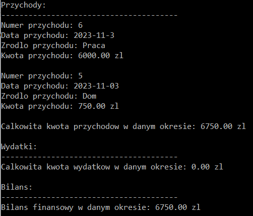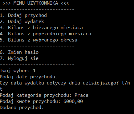 Zaimplementowane funkcjonalności to dodawanie przychodów i